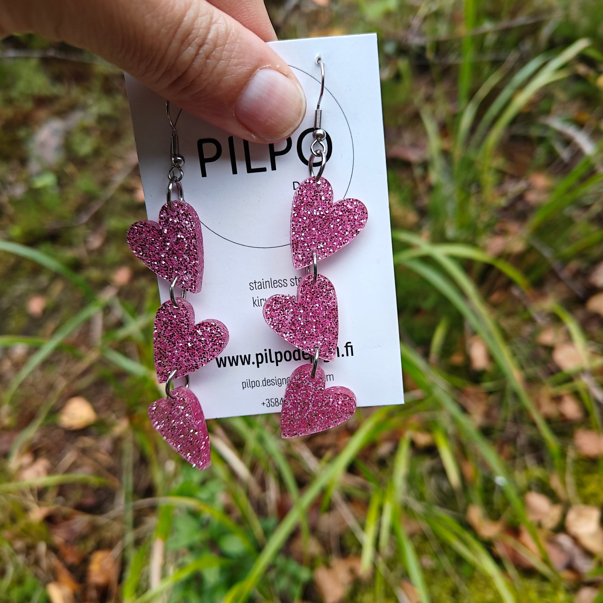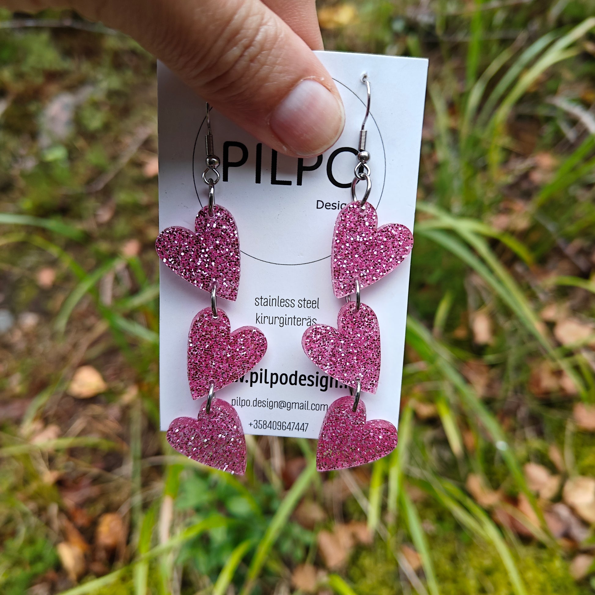 Pilpon korvikset valmistetaan käsityönä ja akryyliosat leikataan Suomessa. Akryyli on materiaalina mukavan kevyttä ja sopii hyvin materiaaliksi korviksiin. Osat laserleikataan suomessa ja akryyli tulee euroopasta. Myös kaikki muut korvisten muovi- ja metalliosat hankimme arvojemme mukaisesti suomalaisilta jälleenmyyjiltä.