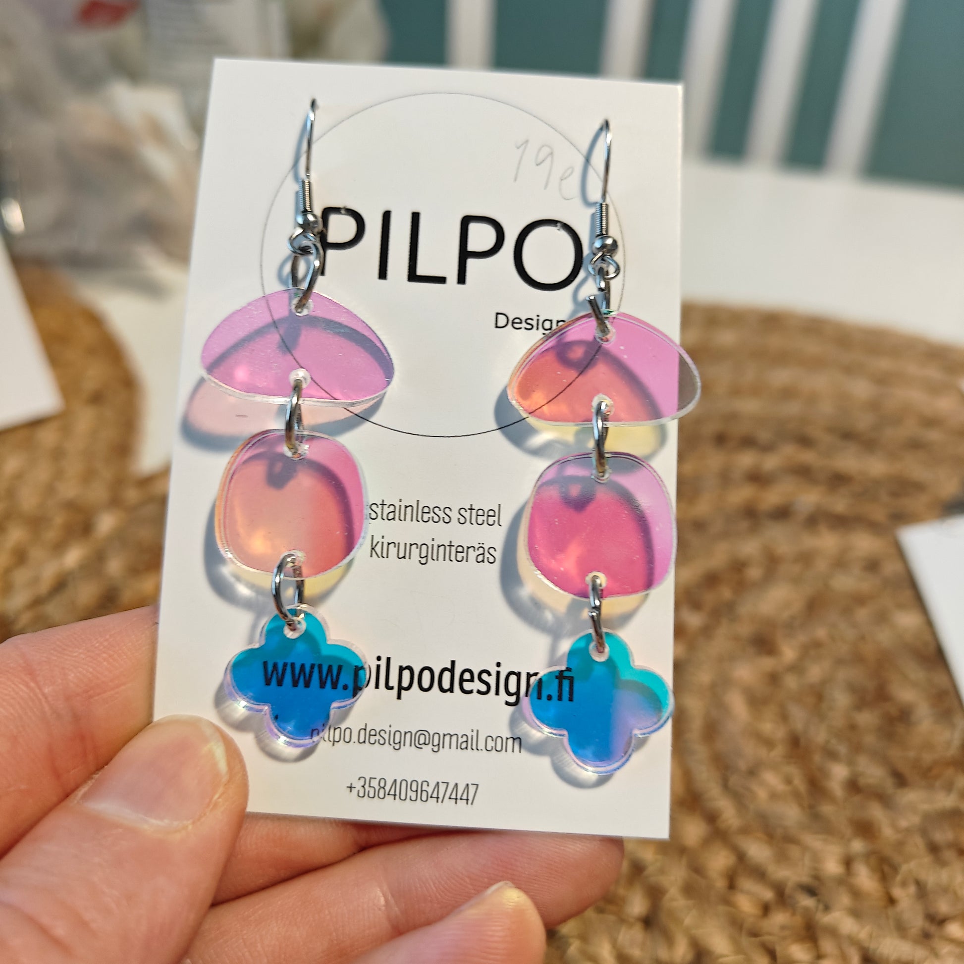 Pilpon korvikset valmistetaan käsityönä ja akryyliosat leikataan Suomessa. Akryyli on materiaalina mukavan kevyttä ja sopii hyvin materiaaliksi korviksiin. Osat laserleikataan suomessa. Myös kaikki muut korvisten muovi- ja metalliosat hankimme arvojemme mukaisesti suomalaisilta jälleenmyyjiltä.