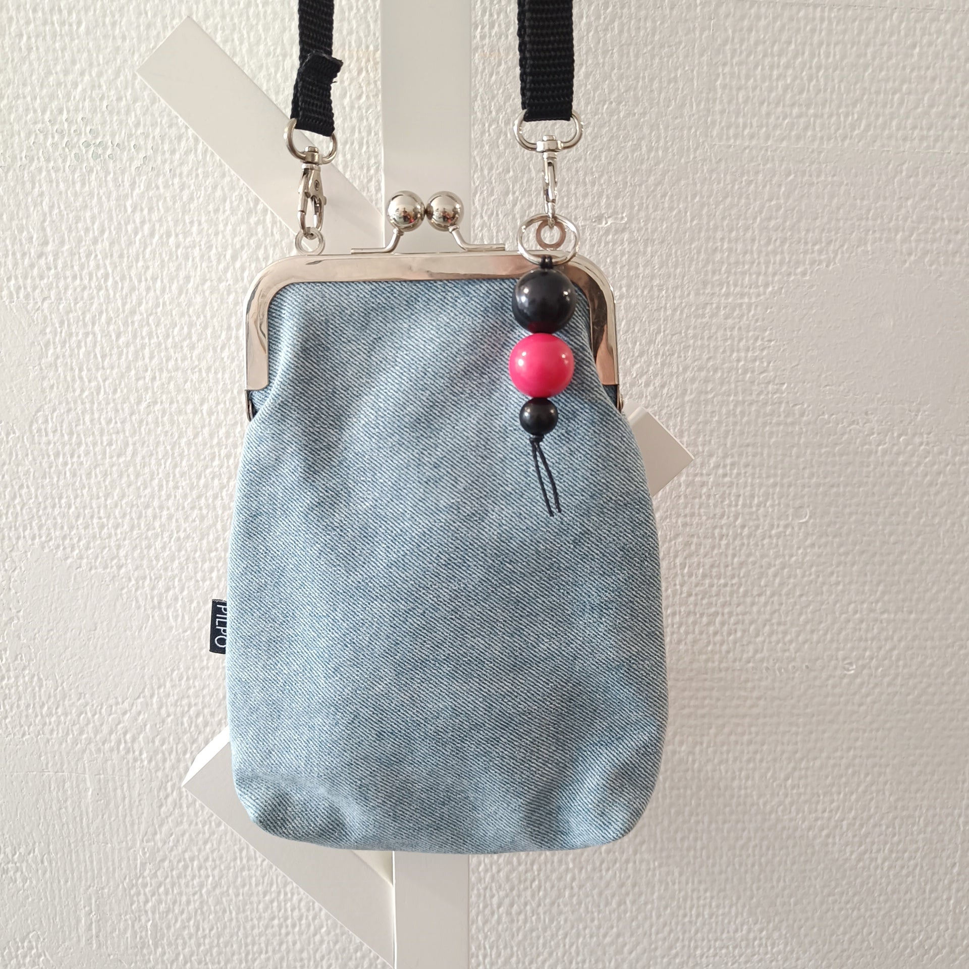 Tämä kännykkälaukku on sinulle juuri sopiva kun kaipaat älypuhelimellesi omaa isompaa pussukkaa. Saat sen kätevästi olan yli säädettävällä hihnalla jonka paksuus on 1,5cm. Hihnan maksimipituus n. 155cm. Mukaan mahtuvat myös vaikka avaimet ja jotain muuta pientä. Laukun kehys on 12cm ja pituus n.20 cm pohja n. 3cm. Käsinpesu.