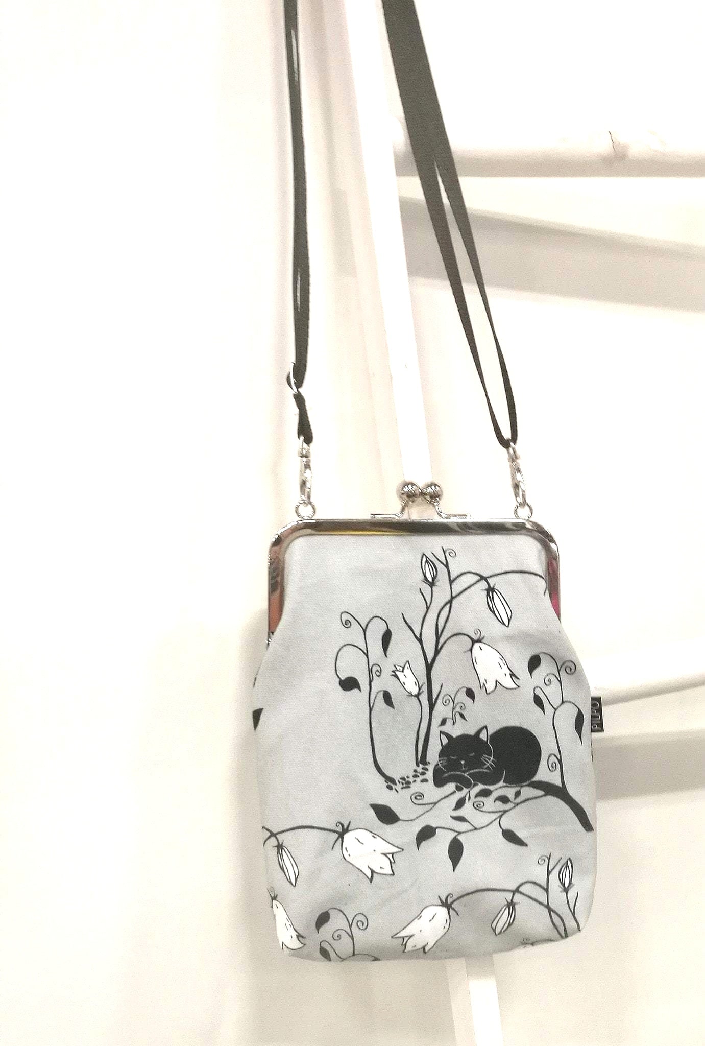 Tähän pieneen ja kätevään M-kokoa olevaan laukkuun saat mahtumaan kukkaron, puhelimen ja jotain muuta pientä ja tarpeellista. Laukku on valmistettu napakasta puuvillakankaasta, samoin vuori on 100% puuvillaa. Laukun kehys on leveydeltään 15cm, muutoin mitat n. 18cm x 22cm, pohja n. 4cm. Sisällä avainnauha. Hihnan leveys 1cm, se on säädettävä ja pisimmillään 160cm.