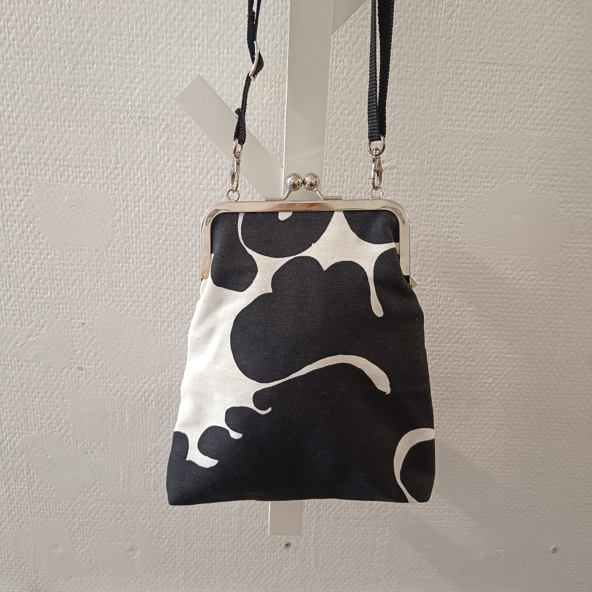 Saat M-laukkuun mahtumaan kukkaron, puhelimen ja jotain muuta pientä ja tarpeellista. Laukku on valmistettu puuvillakankaasta, samoin vuori on 100% puuvillaa. Laukun kehys on leveydeltään 15cm, muutoin mitat n. 18cm x 20cm, pohja n. 4cm. Hihnan leveys 1,5 cm. Hihna on myös säädettävä ja pisimmillään n. 155 cm.