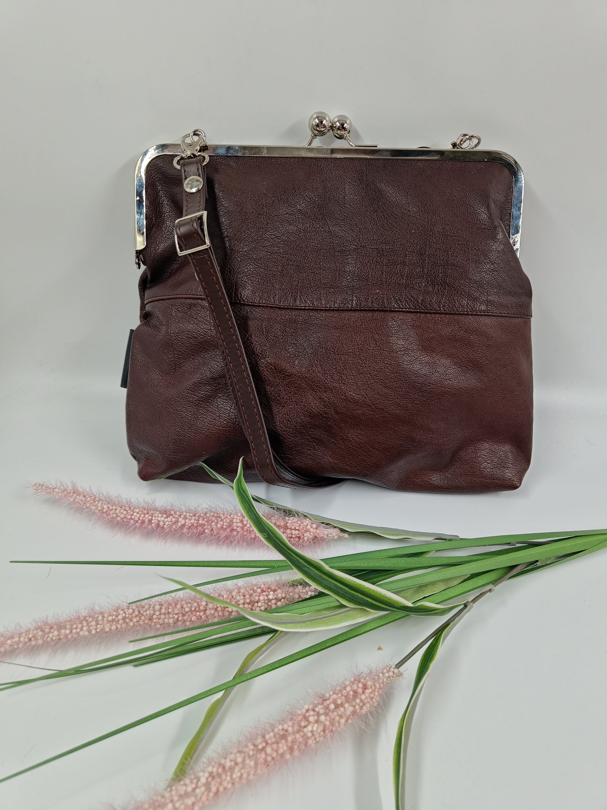 Laukun mitat ovat 28cmx22cm. Kehyksen pituus 25cm. Pohja 6cm. Sisällä avainnauha ja sivutasku joka jaettu kahteen osaan. Laukut valmistetaan vanhoista nahkatakeista, joten laukussa voi näkyä takkien alkuperäisiä saumoja. Jokainen laukku on uniikki. Hihna on säädettävä, 1,5cm paksu, materiaali nahka. Laukun vuori 100% puuvillaa. Postitus/valmistusaikaan varaamme max. 10 arkipäivää.