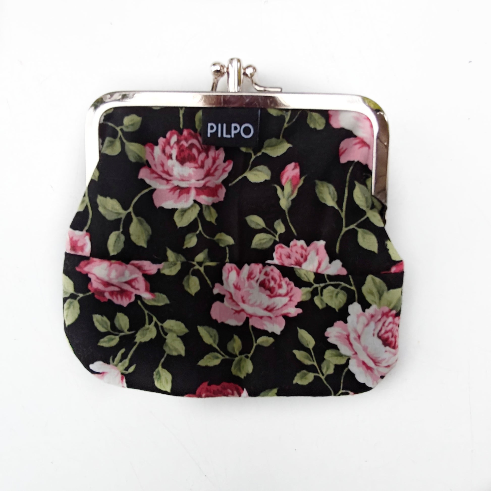 Tuplakukkaro jossa omat puolensa kolikoille ja korteille. Koko n. 10cm x 10cm. Kehyksen väri hopea.