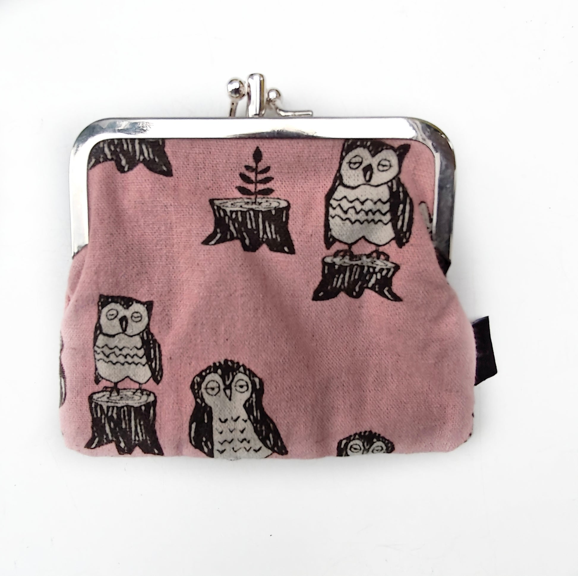 Tuplakukkaro jossa omat puolensa kolikoille ja korteille. Koko n. 10cm x 10cm. Kehyksen väri hopea.