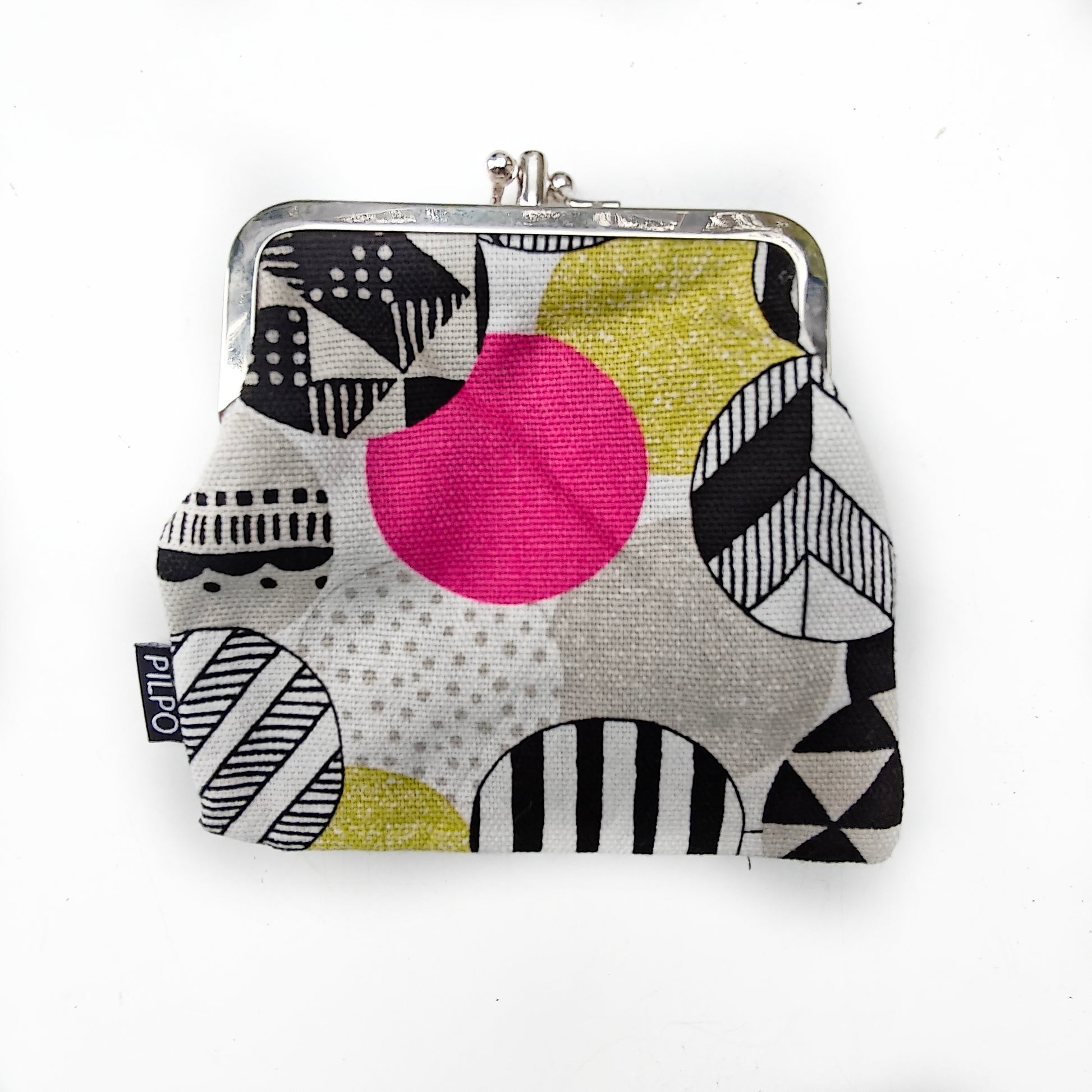Tuplakukkaro jossa omat puolensa kolikoille ja korteille. Koko n. 10cm x 10cm. Kehyksen väri hopea.