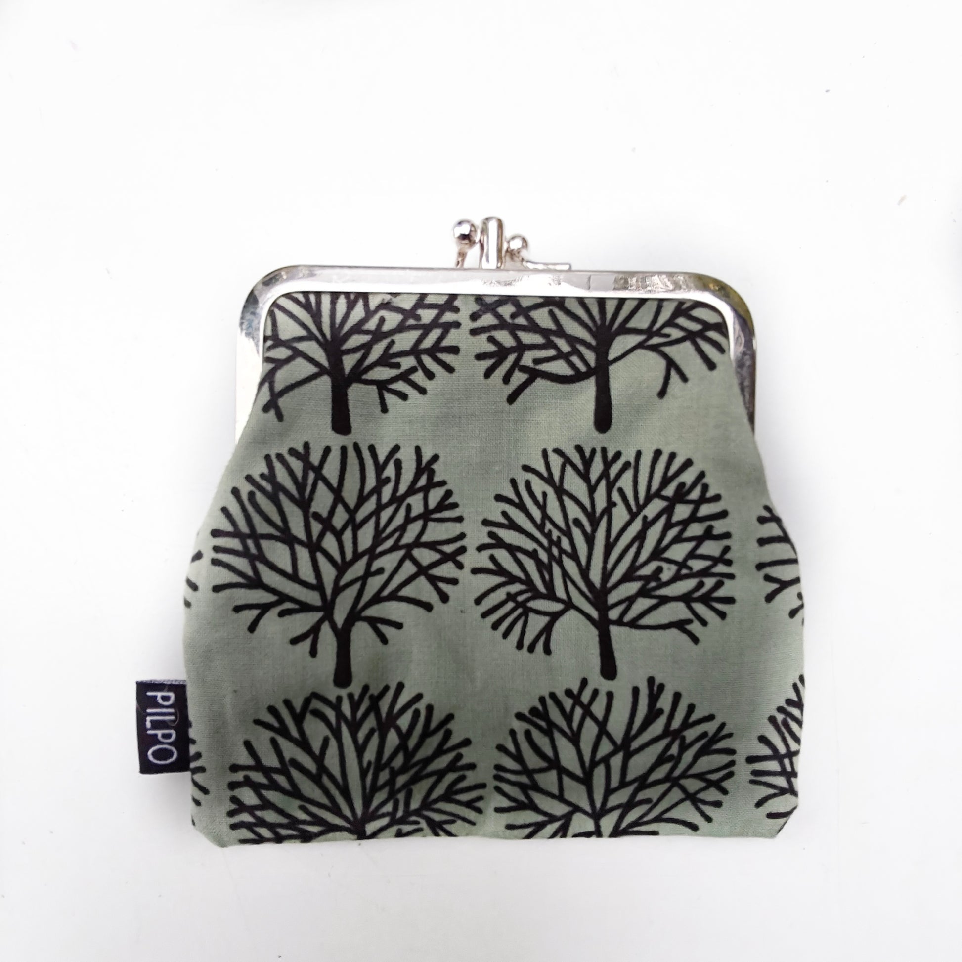 Tuplakukkaro jossa omat puolensa kolikoille ja korteille. Koko n. 10cm x 10cm. Kehyksen väri hopea.