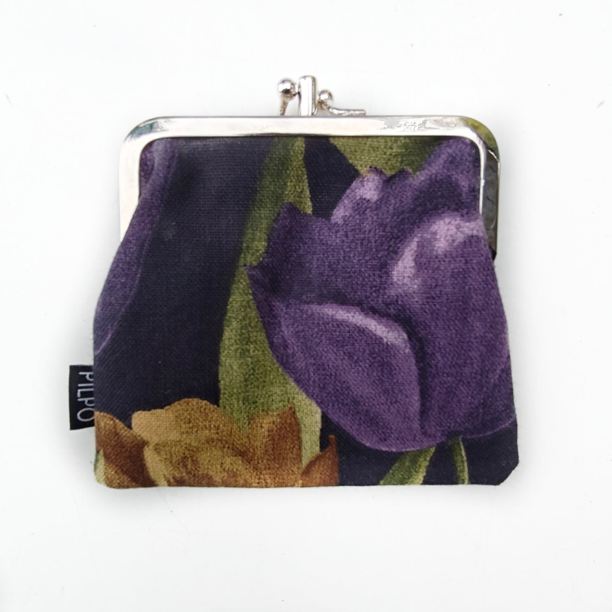 Tuplakukkaro jossa omat puolensa kolikoille ja korteille. Koko n. 10cm x 10cm. Kehyksen väri hopea.