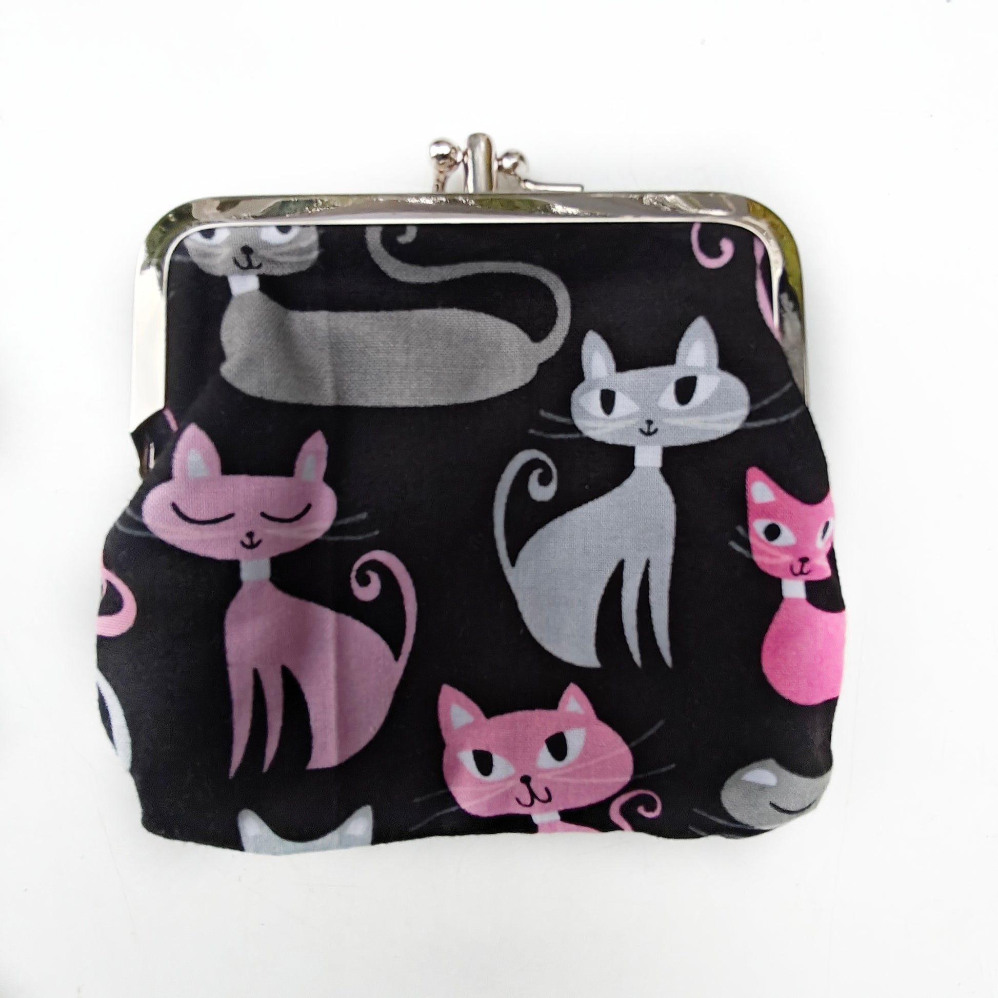 Tuplakukkaro jossa omat puolensa kolikoille ja korteille. Koko n. 10cm x 10cm. Kehyksen väri hopea. Kukkaron toisella puolella on mustaa markiisi kangasta.
