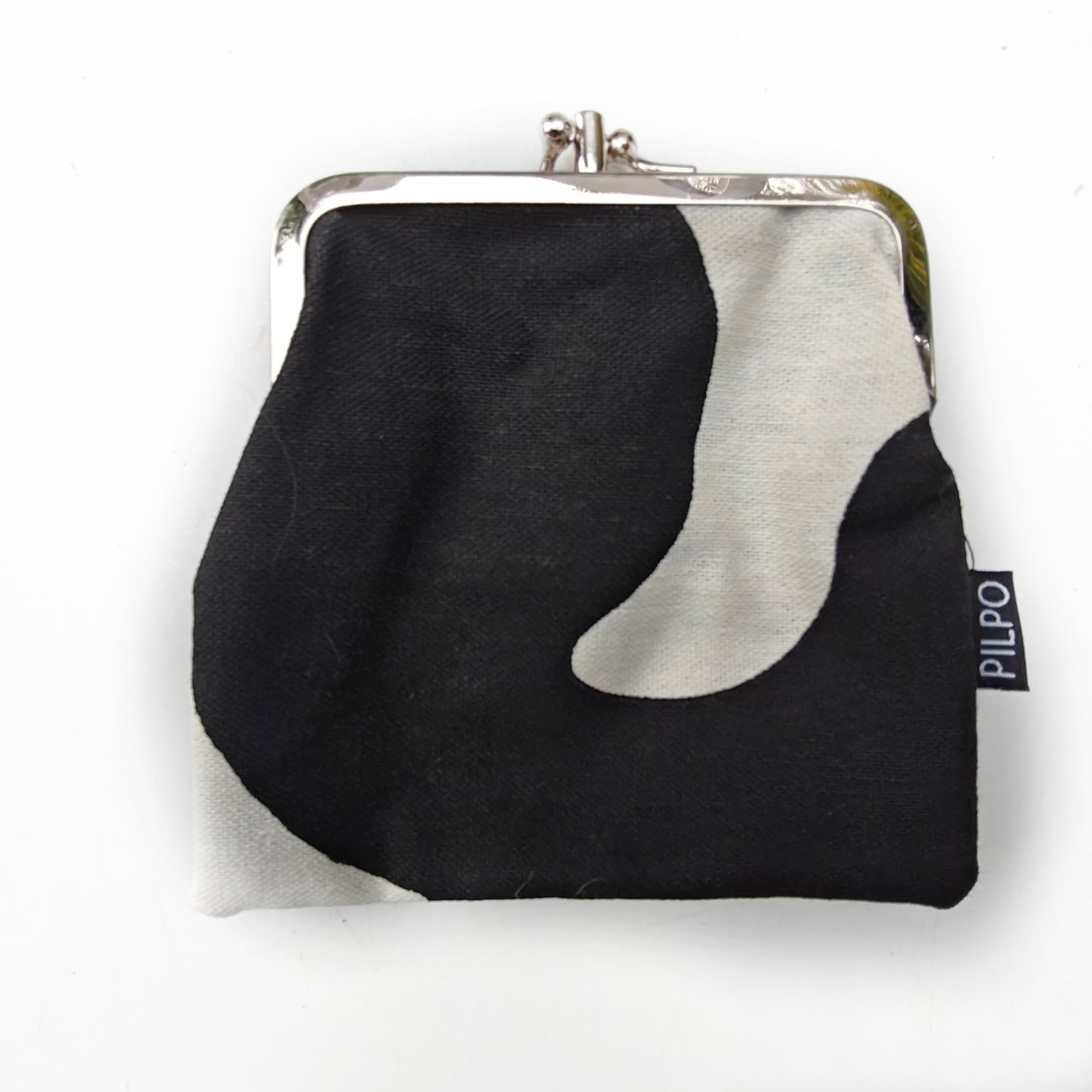 Tuplakukkaro jossa omat puolensa kolikoille ja korteille. Koko n. 10cm x 10cm. Kehyksen väri hopea.